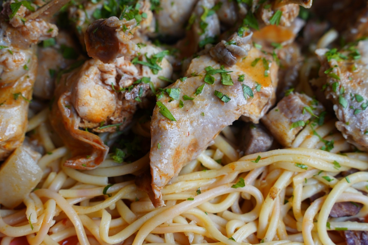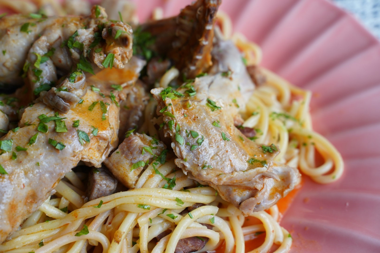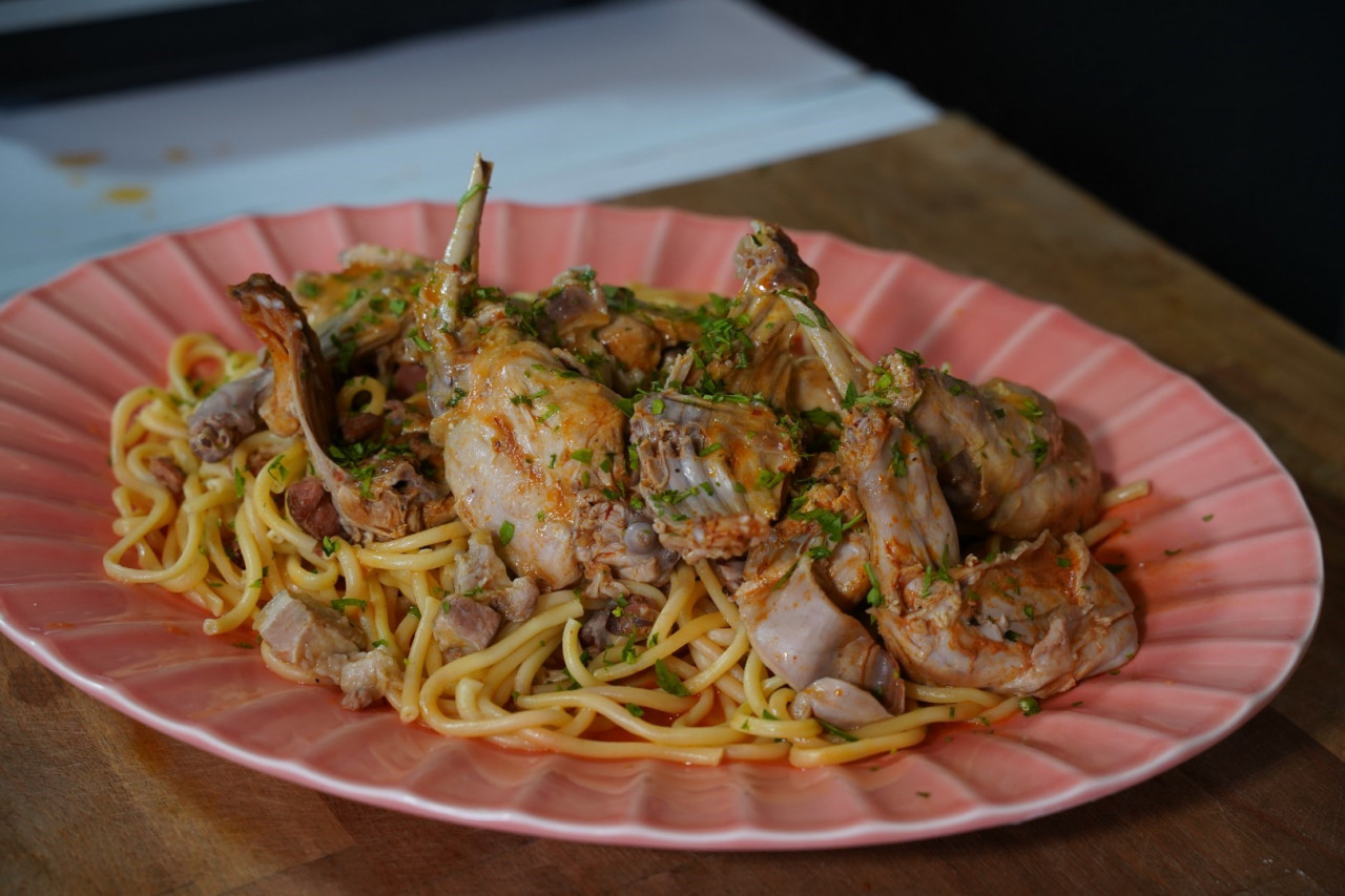 Quanto estiver estufado, retire o coelho e adicione a massa meada.